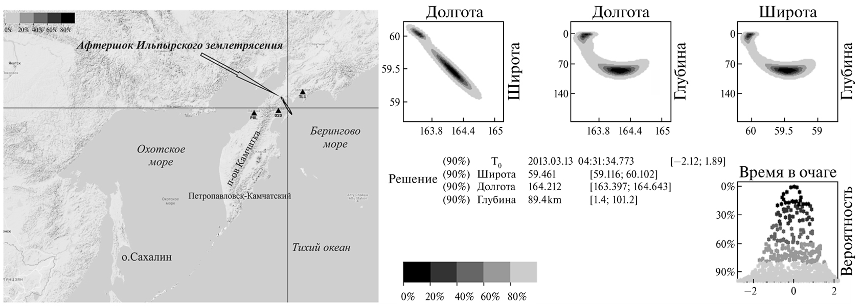 Рис. 7. Апостериорные распределения вероятностных оценок положения гипоцентра и времени в очаге афтершока Ильпырского землетрясения 13.03.2013, MW = 5.8. Данный афтершок магнитуды ML = 4.0 произошел через 1 ч 19 мин после основного толчка. Обозначения как на рис. 5.