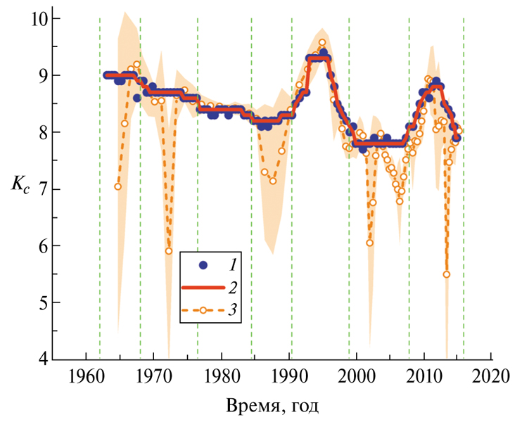 Рис. 1. Изменение представительного класса Kc каталога Камчатки во времени по данным во всем регионе: 1, 2 – авторское программное обеспечение (1 – исходные оценки, 2 – сглаженная кривая); 3 – пакет z-map, заливкой показаны доверительные интервалы. Вертикальными пунктирными линиями показаны выделенные интервалы развития сейсмической сети.