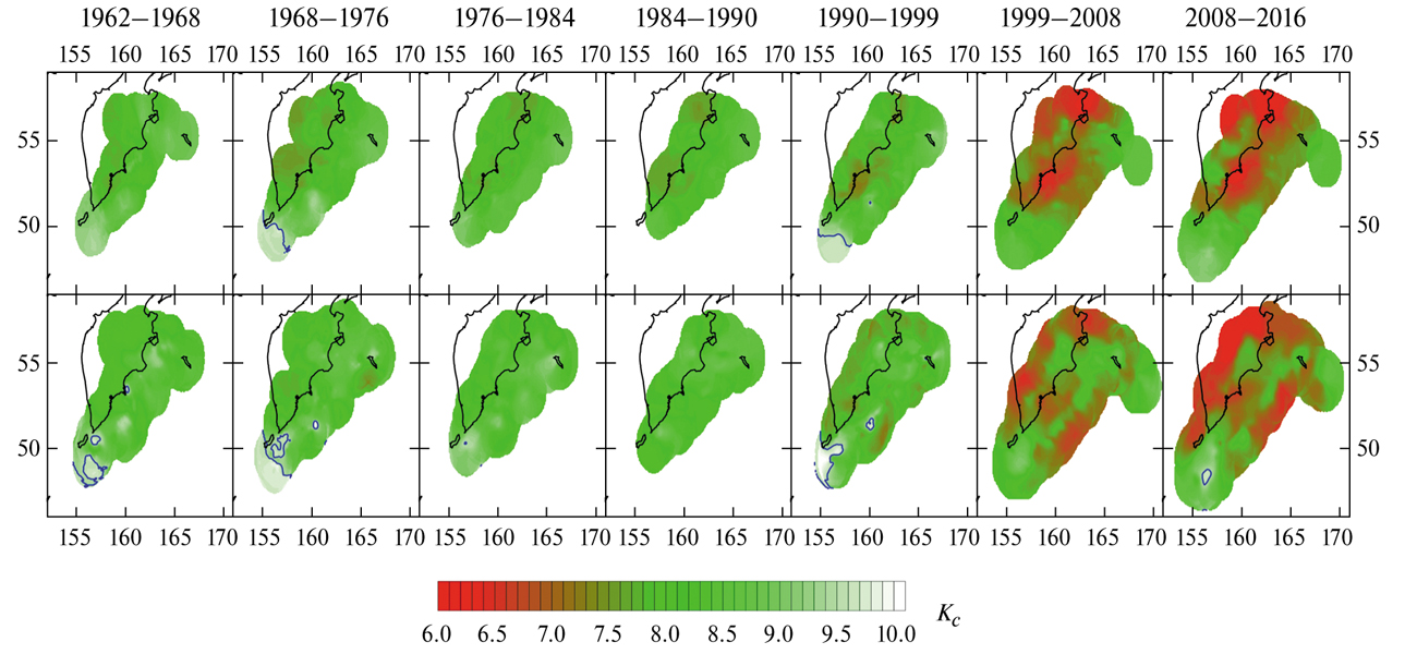 Рис. 2. Изменение представительного класса Kc каталога Камчатки в пространстве в интервалы времени, выделенные на рис. 1. Верхний ряд – авторское программное обеспечение, нижний – пакет z-map. Синей линией показан контур Kc = 9.5.