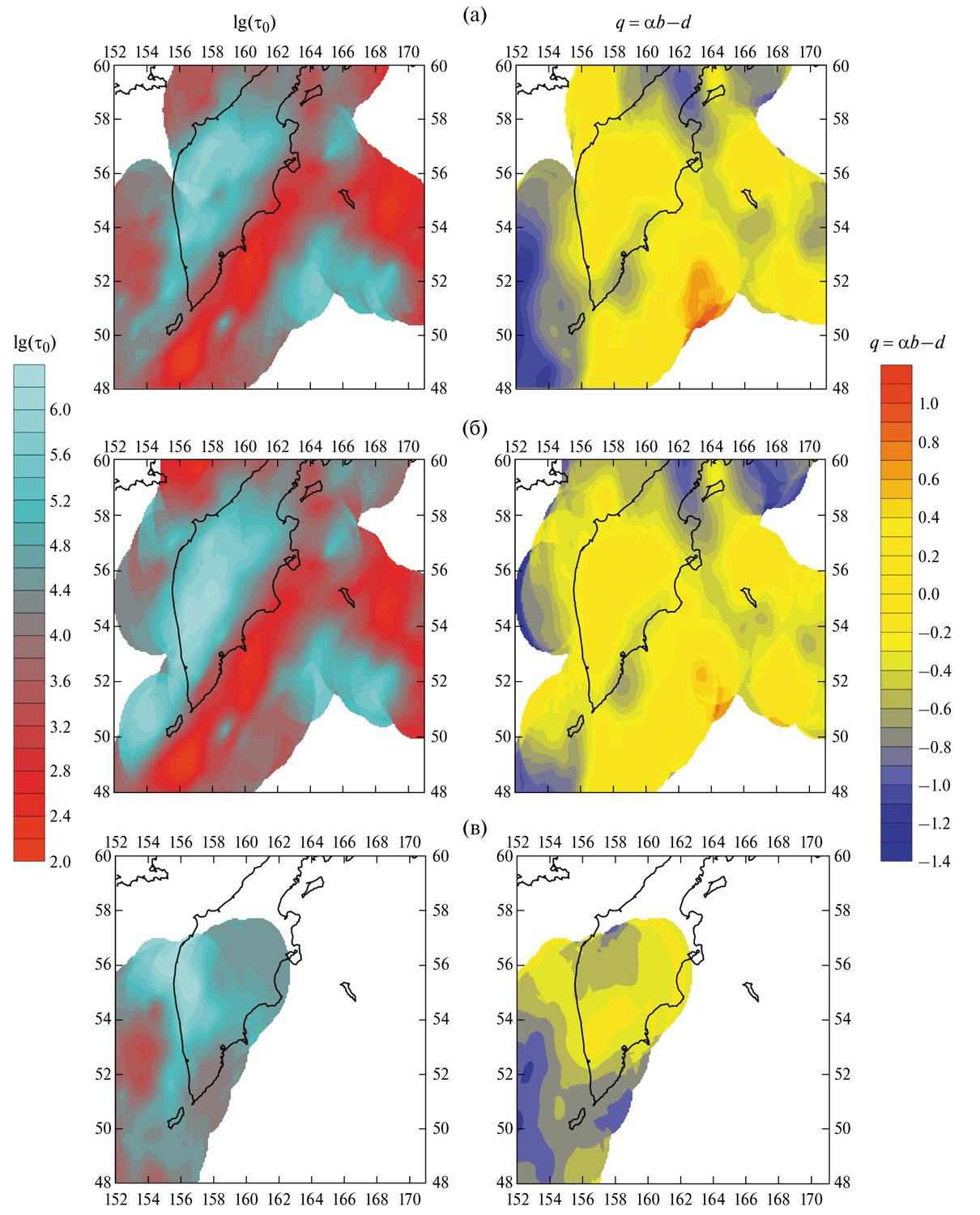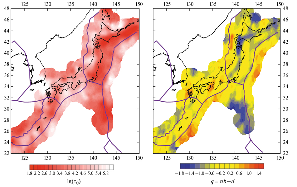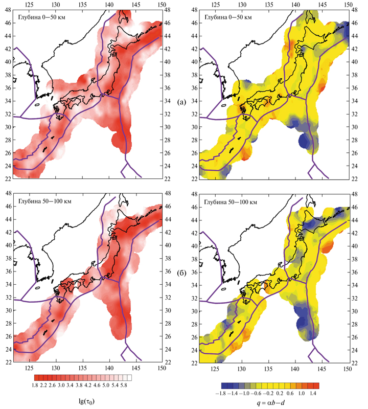 На рис. 4 представлены карты распределения параметров q и τ0 по всему сейсмогенному слою. Каталог JMA позволяет также получить оценки параметров цикла разрушения для двух слоев по глубине: 0–50 и 50–100 км; соответствующие карты приведены на рис. 5.
