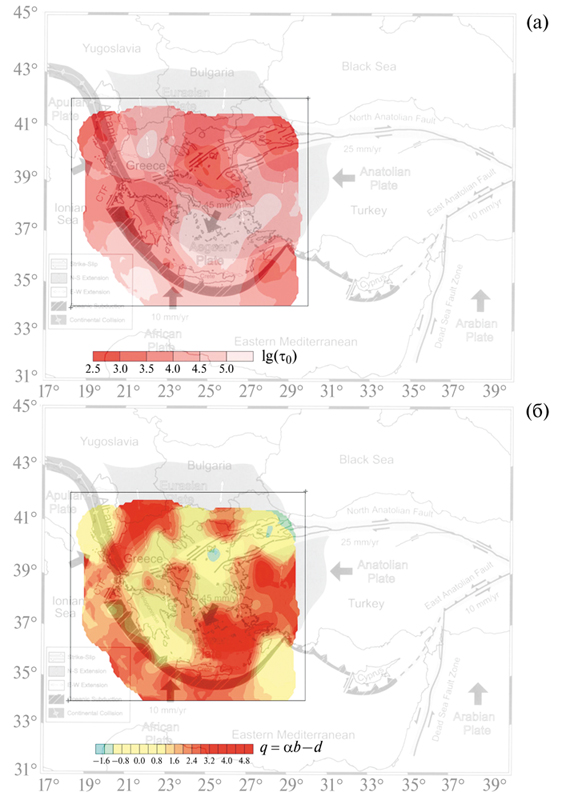 Вариации величины q в пространстве могут объясняться неравномерностью распределения напряжений или скоростей их нарастания по неоднородностям литосферы различных размеров. Это предположение согласуется со значительными отклонениями q от нуля во временны́х вариациях в переходных режимах сейсмического процесса, когда поле напряжений, а, возможно, и прочность среды в локальных областях меняются существенным образом [Смирнов, Пономарев, 2004; Bayrak et al., 2017; Смирнов и др., 2018].