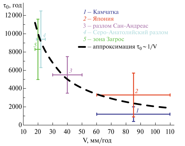 Современные данные позволяют количественно сопоставить на региональном уровне длительность цикла разрушения со скоростью тектонических деформаций. В качестве характеристики последней мы выбрали среднюю скорость относительного движения плит в регионах с ярко выраженными тектоническими структурами трансформных разломов – в зоне субдукции и в сдвиговых зонах.
