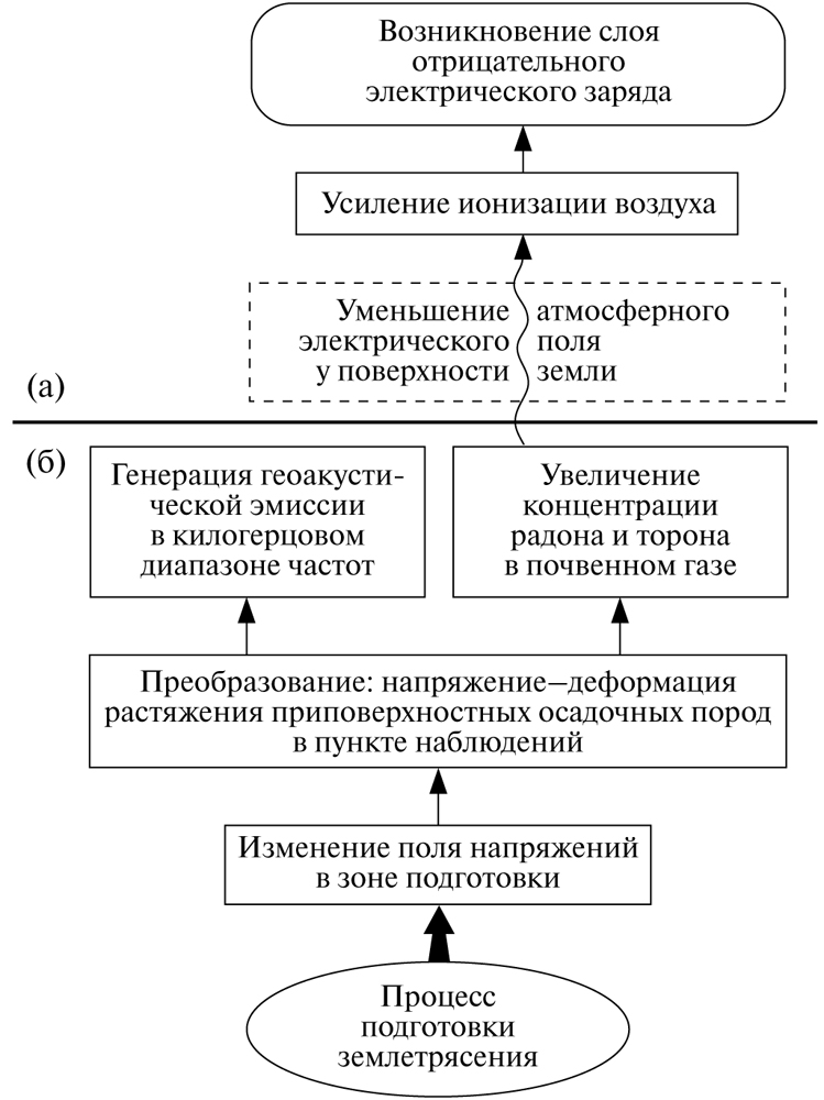 Анализ возмущений нескольких геофизических полей улучшает надежность выделения предвестника землетрясений и может служить основанием при изучении процесса подготовки [Киссин, 2013; Садовский, Писаренко, 1991; Соболев, Пономарев, 2003]. В нашем случае, когда в пункте измерений возникает растяжение приповерхностных осадочных пород и качественно понятна связь между увеличением геоакустической эмиссии, радона, торона и уменьшением атмосферного электрического поля, их совместное исследование заслуживает обоснованного внимания. Если растяжение пород вызвано процессом подготовки землетрясения, возможно совместное возмущение, которое будет его предвестником. Схема образования такого возмущения представлена на рис. 1. Для повышения надежности его выявления необходимы регистрация атмосферного давления, скорости ветра и осадков, которые влияют на поведение геоакустической эмиссии, эманаций и атмосферного электрического поля [Марапулец, Шевцов, 2012; Руленко и др., 2014; Фирстов, Рудаков, 2003].
