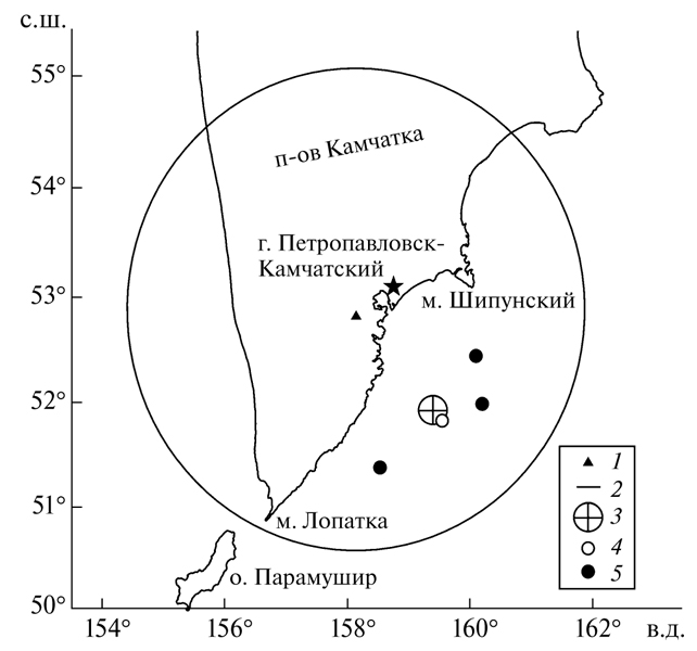 Рис. 2. Расположение пункта наблюдений и эпицентров землетрясений: 1 – пункт «Карымшина»; 2 – окружность радиусом 250 км, обозначающая область выборки землетрясений с энергетическим классом Ks ≥ 9.0; 3 – эпицентр землетрясения 15 октября 2012 г. с Ks = 13.5 (MW = 5.6); 4 – его самый сильный афтершок с Ks = 12.6; 5 – эпицентры землетрясений с Ks > 12.0 во время эксперимента 2013 г.