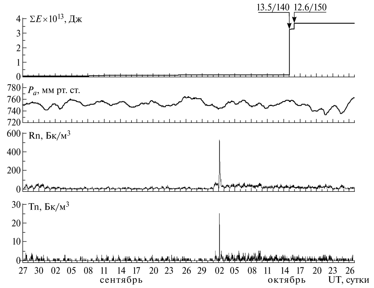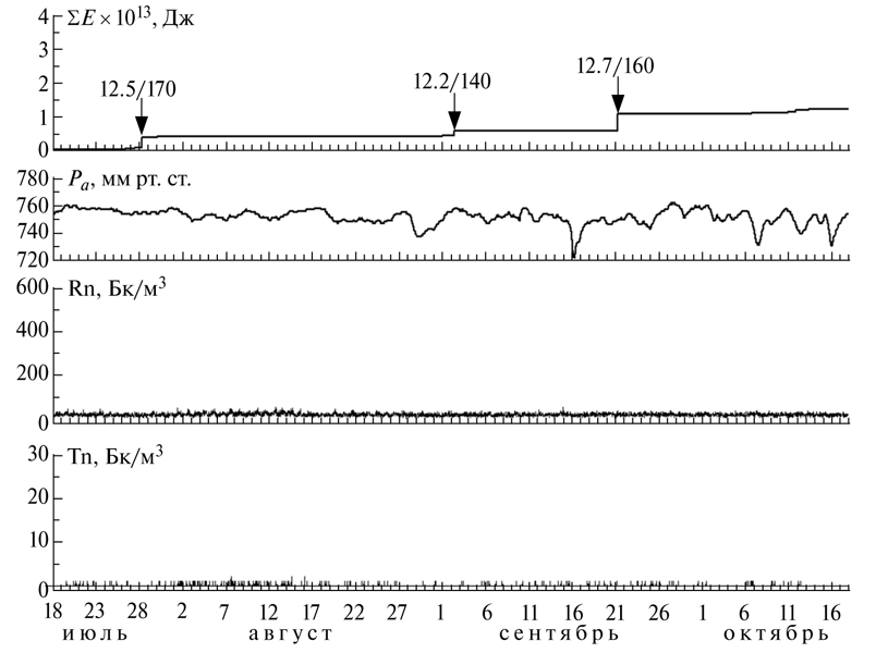 Эксперимент 2012 г. На рис. 3 представлены графики накопления энергии рассматриваемых землетрясений, вариации атмосферного давления, измеренного при помощи климатической камеры радиометра, и объемной активности эманаций. За период измерений, равный 52 суткам, только 2 октября наблюдалось сильное увеличение радона и торона. Максимальные значения Rn и Tn были 526 и 25 Бк/м3, соответственно, и значительно превышали фоновый уровень. Как видно на рис. 3, во время этого увеличения не было сильного уменьшения атмосферного давления длительностью несколько суток, которое возникает при прохождении циклонов и может вызвать увеличение подпочвенного радона [Спивак и др., 2009; Фирстов, Рудаков, 2003; Nishimura, Katsura, 1990]. Отметим, что увеличение объемной активности радона с таким же временем проявления 2 октября зарегистрировано на глубине 1.5 м в 1.7 км от пункта «Карымшина» [Фирстов и др., 2015, рис. 8в].