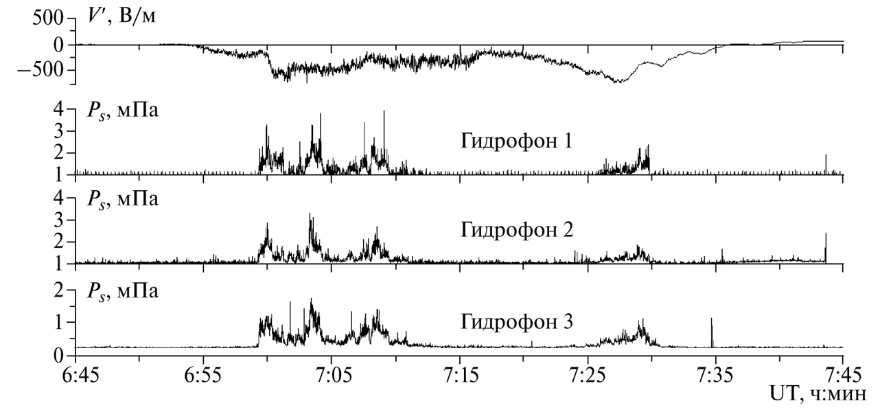Радиометр и флюксметр находились в 50 м от площадки, где были установлены гидрофоны. Для устранения взаимного влияния геоакустических и атмосферно-электрических данных сигналы с гидрофонов и флюксметра поступали на разные аналого-цифровые преобразователи (16- и 14-разрядные, соответственно).