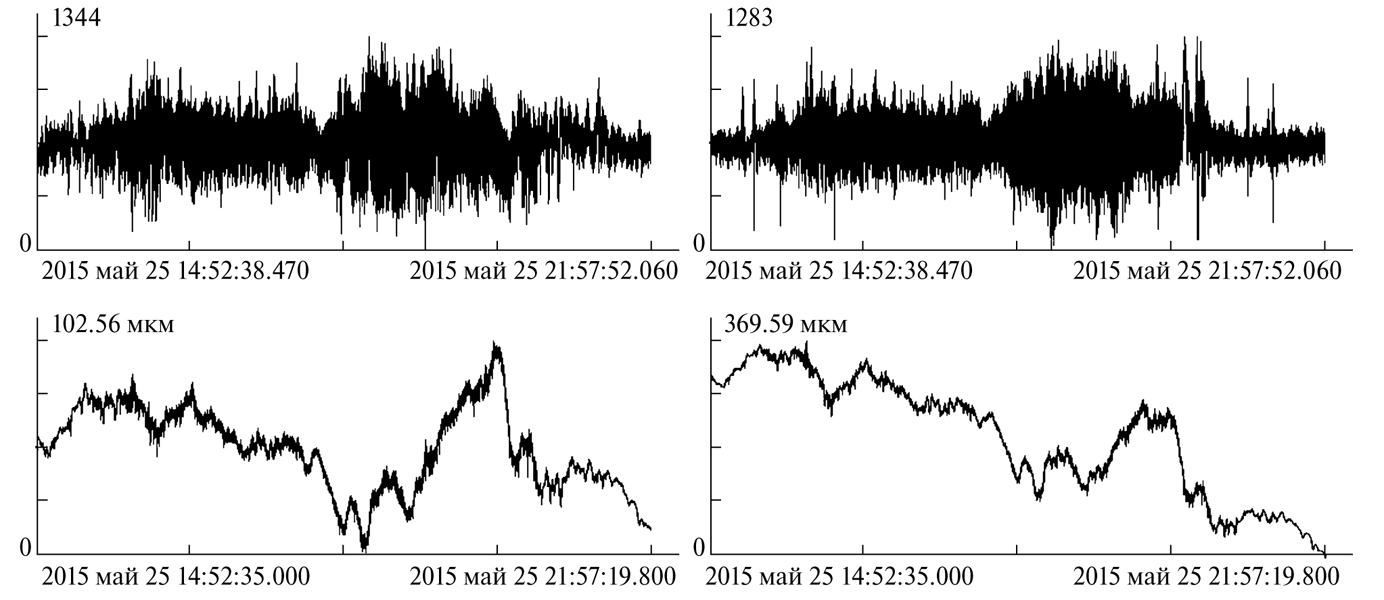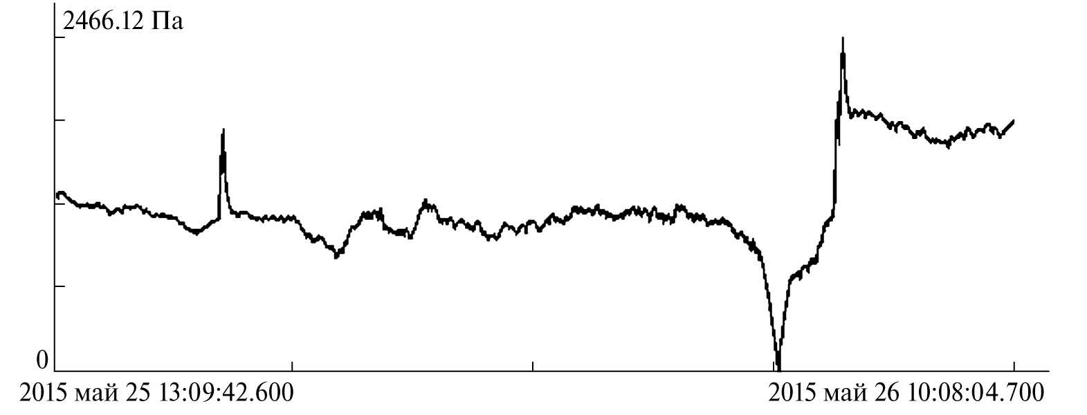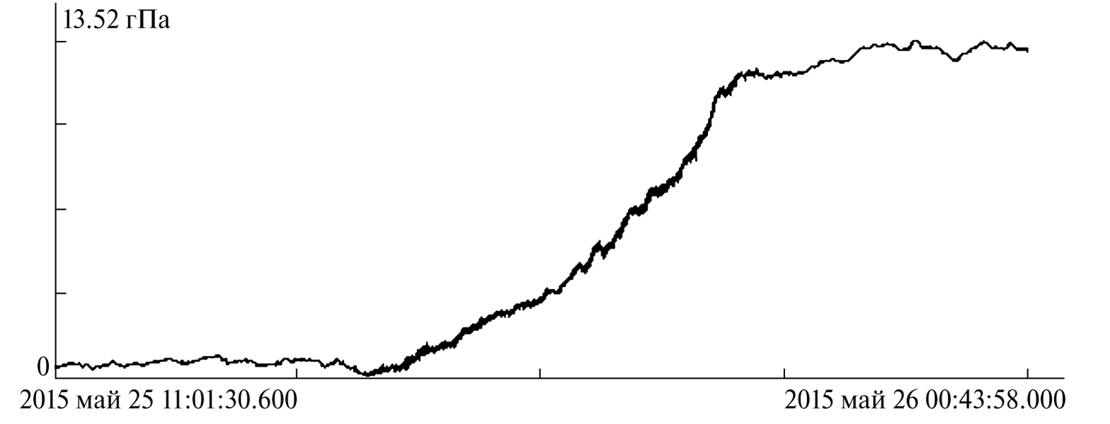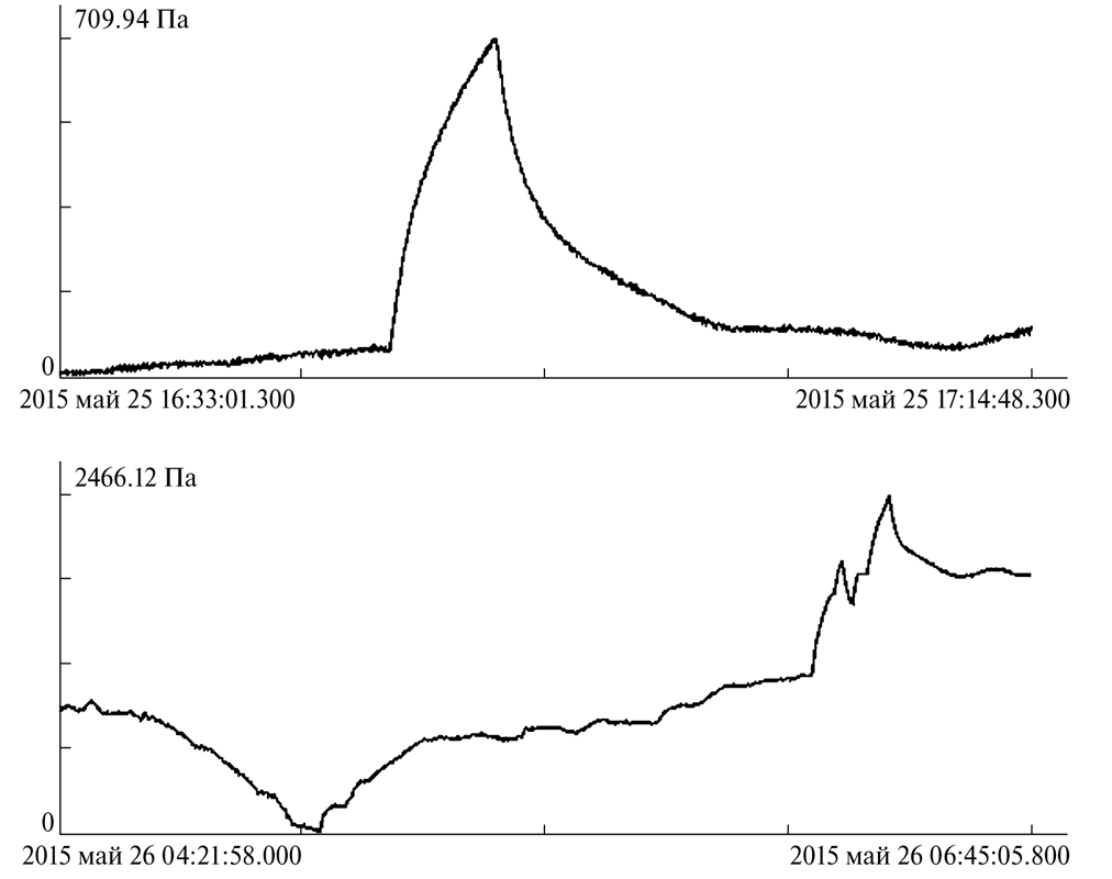 В ходе решения поставленных задач выполнялась обработка и анализ синхронных экспериментальных данных, полученных при регистрации вариаций атмосферного давления лазерным нанобарографом, вариаций гидросферного давления лазерным измерителем вариаций давления гидросферы и изменений деформаций верхнего слоя земной коры лазерными деформографами. Как и в случаях возникновения метеоцунами, описанных в вышеуказанных работах, причиной возникновения длинных морских волн (метеоцунами) явилось резкое изменение атмосферного давления, в нашем случае зарегистрированное лазерным нанобарографом. На рис. 1 приведена запись лазерного нанобарографа, на которой зарегистрировано резкое изменение атмосферного давления порядка 13.5 гПа, по своим характеристикам относящееся к метеоцунами. Резкое изменение атмосферного давления, совпадение скорости распространения атмосферного возмущения со скоростью распространения длинных океанических волн и направление распространения атмосферного возмущения аналогичны возмущениям, возникающим при метеоцунами. Это также подтверждается данными измерения вариаций гидросферного давления лазерным измерителем вариаций гидросферного давления, который был установлен в это время на шельфе Японского моря на удалении 300 м от берега и 400 м от лазерного нанобарографа на глубине моря 33 м. На записях прибора наблюдались большие скачки гидростатического давления как во время резкого изменения атмосферного давления, так и после прохождения фронта. Так, если за начало резкого изменения атмосферного давления принять 15 ч 20 мин 25 мая, то возмущение, зафиксированное лазерным измерителем вариаций гидросферного давления, было зарегистрировано в 16 ч 44 мин 25 мая (рис. 2). А второе возмущение было зарегистрировано в 04 ч 20 мин 26 мая, причем по своему характеру изменения оно отличается от первого. В первом случае пришла уединенная волна почти солитоноподобной формы (рис. 3, верхний), которая вызвала резкое увеличение гидростатического давления. Причем высота этой волны в четыре раза больше амплитуды суточного прилива в данном регионе в данное время, а время прохождения волны через точку установки прибора составило примерно 14.5 мин.