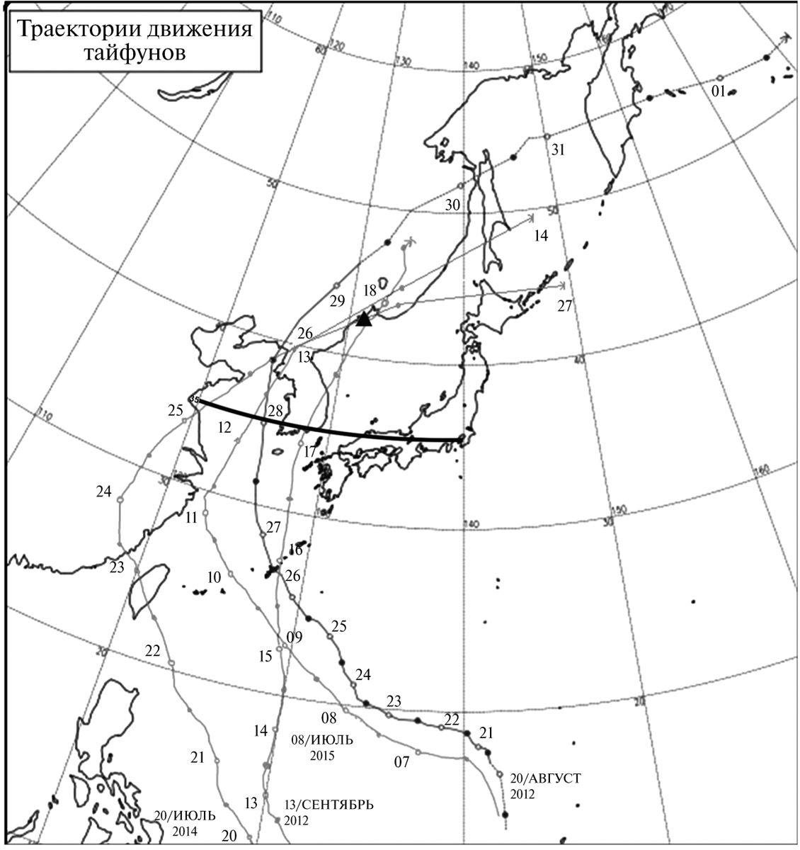 Рис. 1. Комплексная карта траекторий движения тайфунов: треугольник – место расположения измери-тельного комплекса; черный круг – 00:00 (JST); белый круг – 12:00 (JST); жирная линия – линия начала воз-действия циклонического вихря на полигон (35° с.ш.).