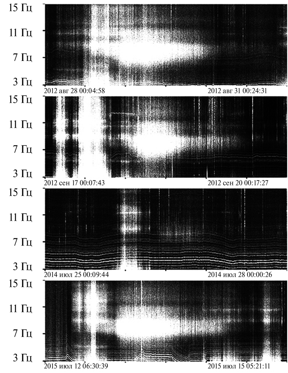 Рис. 2. Динамические спектрограммы экспериментальных данных одного из лазерных деформографов, направленного по оси «север–юг», с длиной измерительного плеча 52.5 м в диапазоне «голоса моря», в периоды воздействия тайфунов на регион. Сверху вниз: тайфун Болавен, тайфун Санба, тайфун Матмо, тайфун Чан-хом.