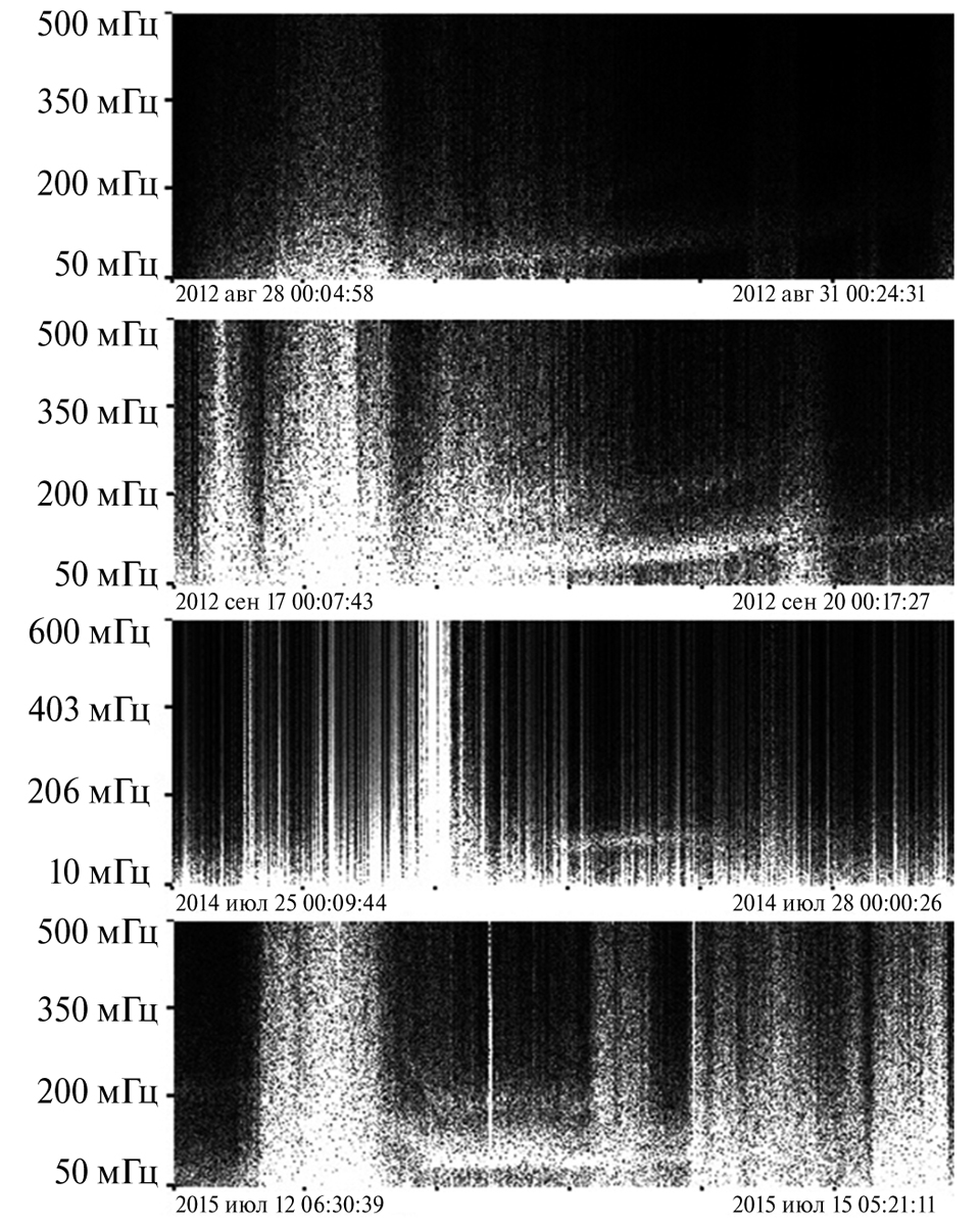 4. Fig. 3. Dynamic spectrograms of experimental data from one of the laser deformographs, directed along the north-south axis, with a measuring arm length of 52.5 m in the frequency range of sea waves, during periods of typhoon exposure to the region. From top to bottom: Typhoon Bolaven, Typhoon Sanba, Tai-Fun Matmo, Typhoon Chan Hom.