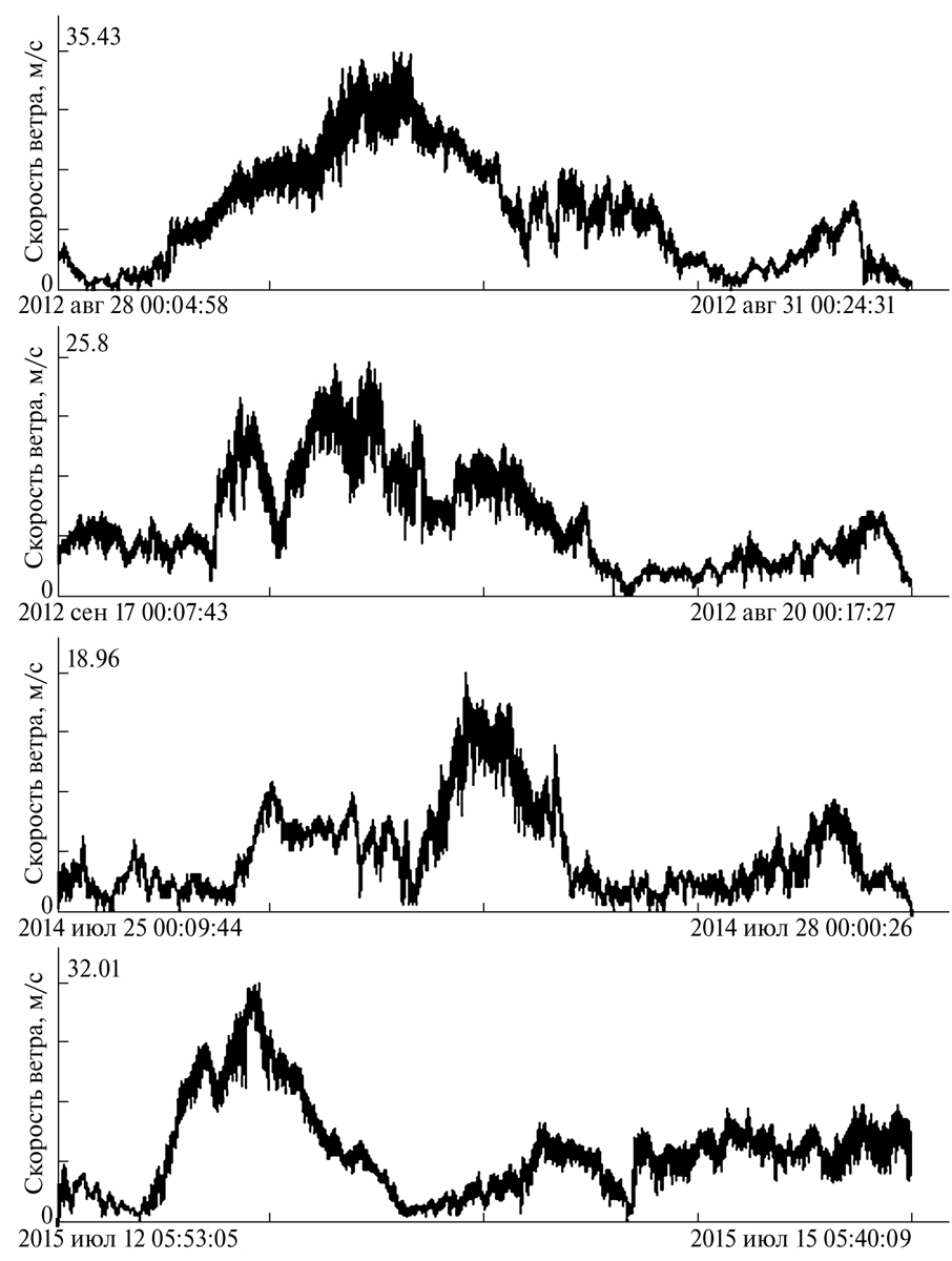 Рис. 4. Осциллограммы скорости ветра в периоды воздействия тайфунов на регион.