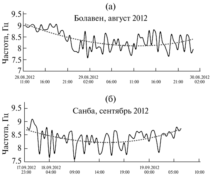 Рис. 5. Графики зависимости доминирующей частоты от времени и места нахождения центра тайфунов: (а) – Тайфун Болавен; (б) – Тайфун Санба.