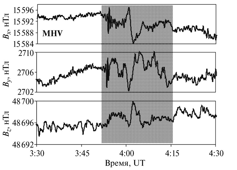 В качестве примера на рис. 1 приведена запись компонент Bx, By и Bz магнитного поля Земли[1], полученная в ГФО MHV в период землетрясения 29.08.2018 г. (Новая Каледония). Землетрясение магнитудой М = 7.1 произошло в 03:51 UT на глубине 26 км. Приведенные на рис. 1 данные свидетельствуют о ярко выраженных вариациях магнитного поля в период землетрясения. При этом отчетливо выделяется цуг короткопериодных повышенных геомагнитных вариаций с периодом 50 с, начало которого зафиксировано в 03:53 UT, фактически сразу после основного толчка (время запаздывания относительно основного толчка составляет 2 мин). Максимальная амплитуда вариаций на этой стадии составила 4 нТл, ее длительность 3 мин. Как это видно из рис. 1, короткопериодные вариации в большей степени проявились на горизонтальных компонентах магнитного поля.