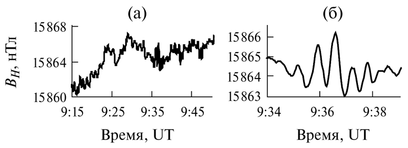 Начало короткопериодных возмущений (период 0.6 мин) регистрируется в 09:35 UT (спустя 5 мин после основного толчка). При этом выделяется основное возмущение длительностью 3 мин и амплитудой 1.5 нТл, после которого в течение некоторого времени наблюдаются повышенные вариации BH.