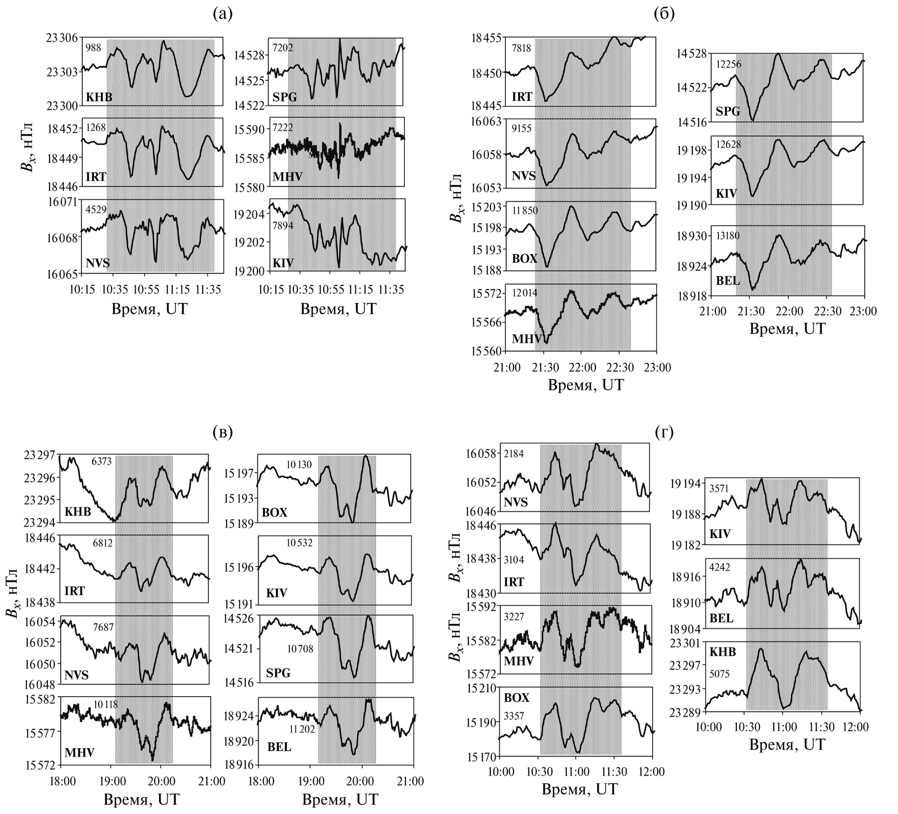 Значительный интерес представляет рассмотрение геомагнитных возмущений в обсерваториях, расположенных на разных расстояниях от очага землетрясения. В качестве примера на рис. 3а3г приведены записи горизонтальной, наиболее возмущенной компоненты Вx, полученные в MHV и в некоторых обсерваториях сети INTERMAGNET в периоды землетрясений 2018 г. из списка табл. 2. Из данных рис. 3 следует, что при глубине очага более 30 км наблюдаются только длиннопериодные геомагнитные возмущения (период от 15 до 30 мин), которые имеют сходную морфологию и возникают практически одновременно на записях обсерваторий, отстоящих друг от друга на значительном расстоянии.