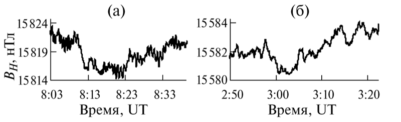 Рис. 4. Вариации горизонтальной компоненты магнитного поля, зарегистрированные в MHV, в периоды землетрясений 07.08.2016 г. на Северном Кавказе (а) и 10.01.2018 г. в Гондурасе (б).