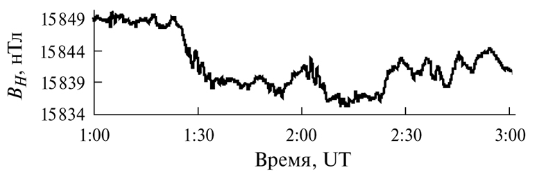 В отдельных случаях (события 10.04.2018 г. и 07.09.2018 г. из табл. 2) реакция магнитного поля на землетрясения проявляется в виде комбинации общего уменьшения индукции магнитного поля с наложением его хорошо выраженных длиннопериодных вариаций. На рис. 5 в качестве примера представлены вариации магнитного поля в период землетрясения с магнитудой 6.2, произошедшего 07.09.2018 г. в Эквадоре. Из рис. 5 следует, что на фоне основного бухтообразного уменьшения магнитного поля выделяются участки его повышения с элементами периодичности. И, наконец, на последней стадии, начиная с 02:30 UT регистрируются длиннопериодные вариации магнитного поля с периодом 6.4 мин.
