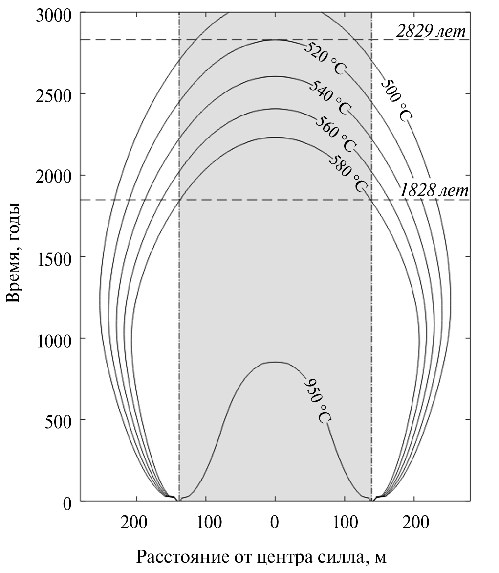 При моделировании приняты следующие значения теплофизических параметров: теплота кристаллизации расплава 419 кДж/кг [Huppert, Sparks, 1988], теплоемкость расплава 1340 Дж/(кг °C) [Huppert, Sparks, 1988], теплоемкость долерита 890 Дж/(кг °C) [Schön, 1998], теплопроводность расплава 1.5 Вт/(м °C) [Gutiérrez, Parada, 2010], теплопроводность долерита 2.3 Вт/(м °C) [Schön, 1998]. Расчет теплоемкости и теплопроводности магмы в диапазоне температур кристаллизации выполнялся в приближении линейной диаграммы плавкости. Плотность трахибазальтового расплава и трахидолерита принята одинаковой 3000 кг/м3, такое упрощение позволяет не учитывать в расчете эффект термоусадки. Для вмещающих песчаников приняты следующие значения теплофизических параметров: теплоемкость 870 Дж/(кг °C), теплопроводность 2.4 Вт/(м °C), плотность 2600 кг/м3 [Schön, 1998]. Внедрение предполагается одноактное без длительного течения магмы по каналу, т. е. в начальный момент времени температура боковых пород предполагается постоянной. Более сложную модель, учитывающую возможность нескольких последовательных импульсов внедрения магмы, описанную в работе [Аnnen et al., 2015] как механизм формирования крупных субпластовых интрузий, мы не рассматриваем, поскольку имеющиеся геологические сведения о строении моделируемых ергалахских силлов не позволяют ее принять.