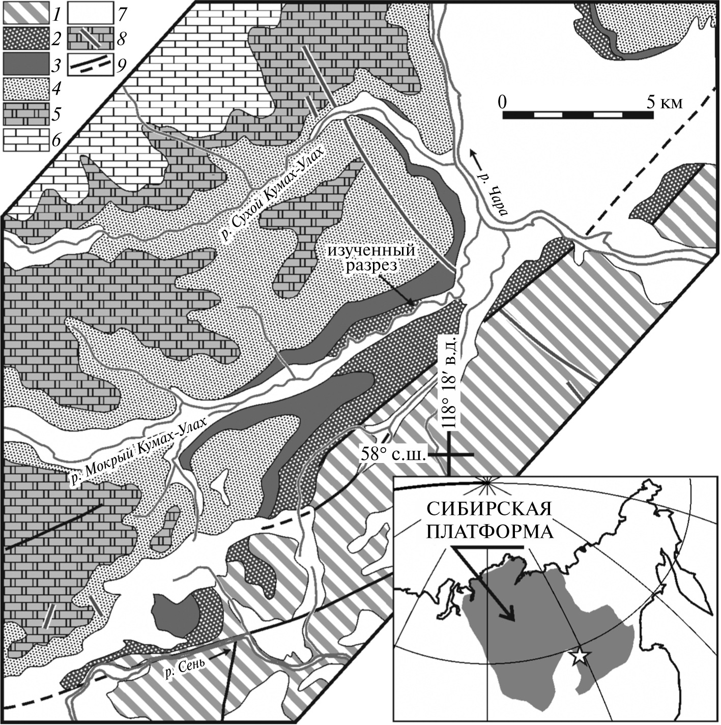 Рис 1. Геологическая схема района работ: 1 – раннедокембрийские комплексы кристаллического фундамента Сибирской платформы; неопротерозойские осадочные толщи; 2–5 – дальнетайгинская серия (2 – ничатская и 3 – кумах-улахская свиты, 4 – нижняя и 5 – верхняя подсвиты сеньской свиты); 6 – торгинская свита жуинской серии; 7 – четвертичные аллювиальные и ледниковые отложения; 8 – дайки габброидов; 9 – разломы достоверные и предполагаемые. Звездочка на врезке – положение района работ, GPS-координаты разреза: 58.04270° с. ш., 118.24381° в. д. Схема составлена на основе ГГК-200.
