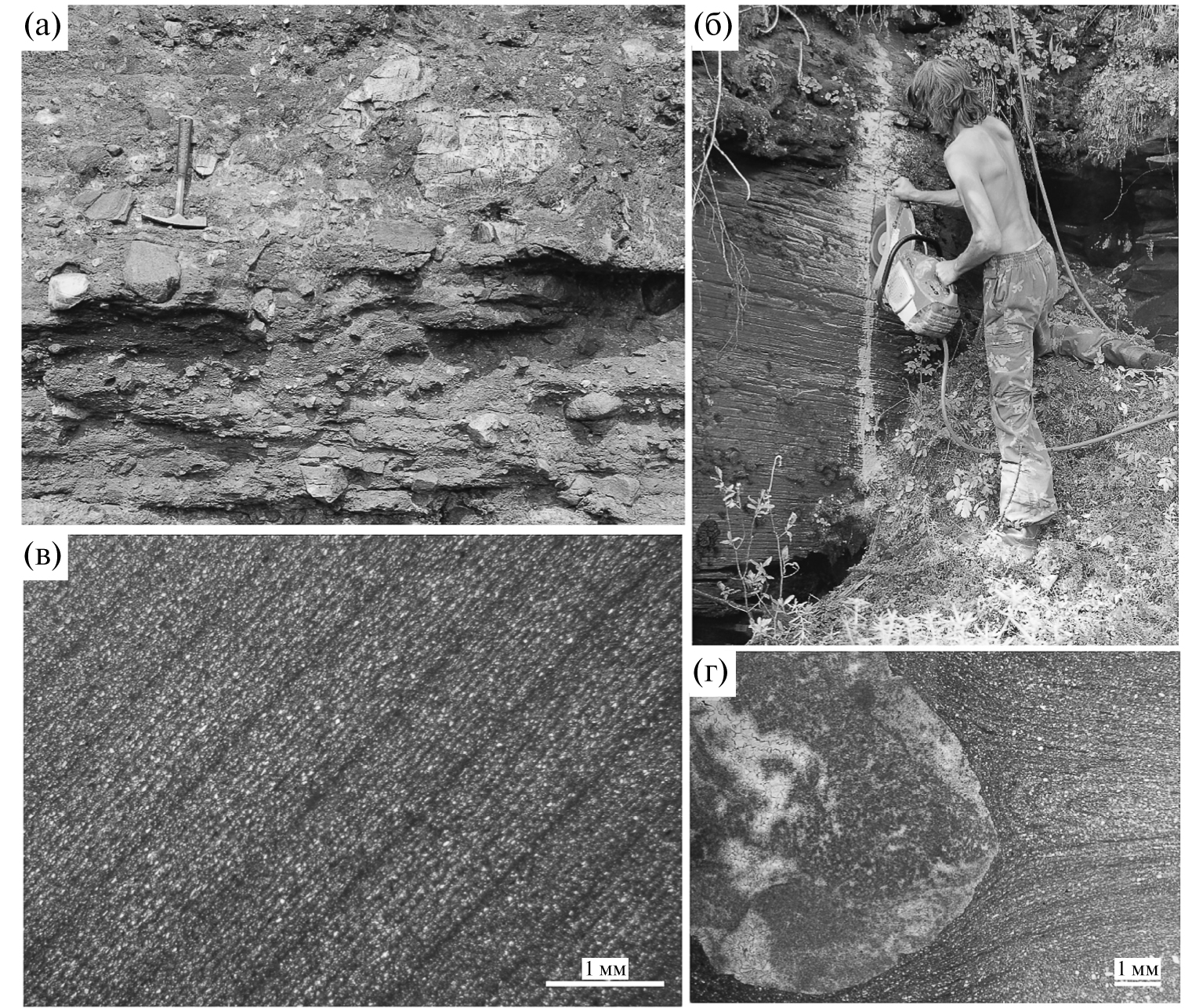 Рис 2. Фотоизображения пород ничатской свиты в разрезе по р.Мокрый Кумах-Улах: (а) – плохосортированные диамиктиты (тиллиты) основания разреза; (б) – изученная пачка тонкослоистых алевродоломитов (отбор сплошной пробы); (в) – фото шлифа тонкослоистых алевродоломитов с выраженной 11 летней цикличностью; (г) – фото шлифа тонкослоистых алевродоломитов с дропстоуном.