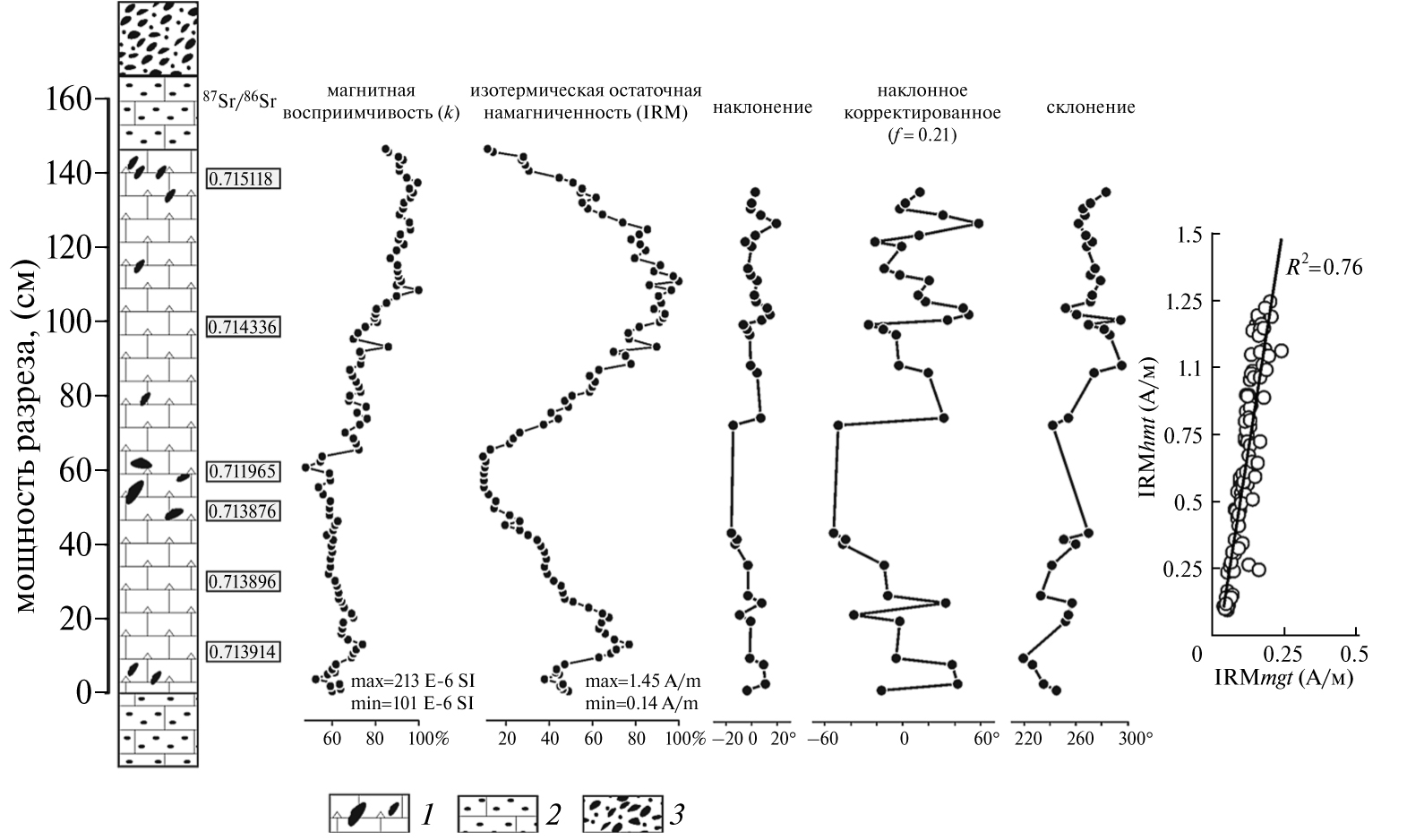 Величина магнитной восприимчивости пород (k) имеет выдержанные значения ( 100200× Е6 ед. СИ) и испытывает незначительные направленные флуктуации, увеличиваясь в нижней и верхней трети разреза и снижаясь в основании верхней и в средней части разреза, содержащей обильную примесь материала, поступавшего в результате ледового разноса (рис. 3). Подобным образом, но с большей амплитудой, изменяется величина изотермической остаточной намагниченности (IRM), отражающая концентрацию магнитных минералов в породе (рис. 3). Вклад магнитомягкой «магнетитовой» составляющей обнаруживает прямую корреляцию с вкладом магнитожесткой «гематитовой» составляющей IRM (коэффициент корреляции 0.76, рис. 3).