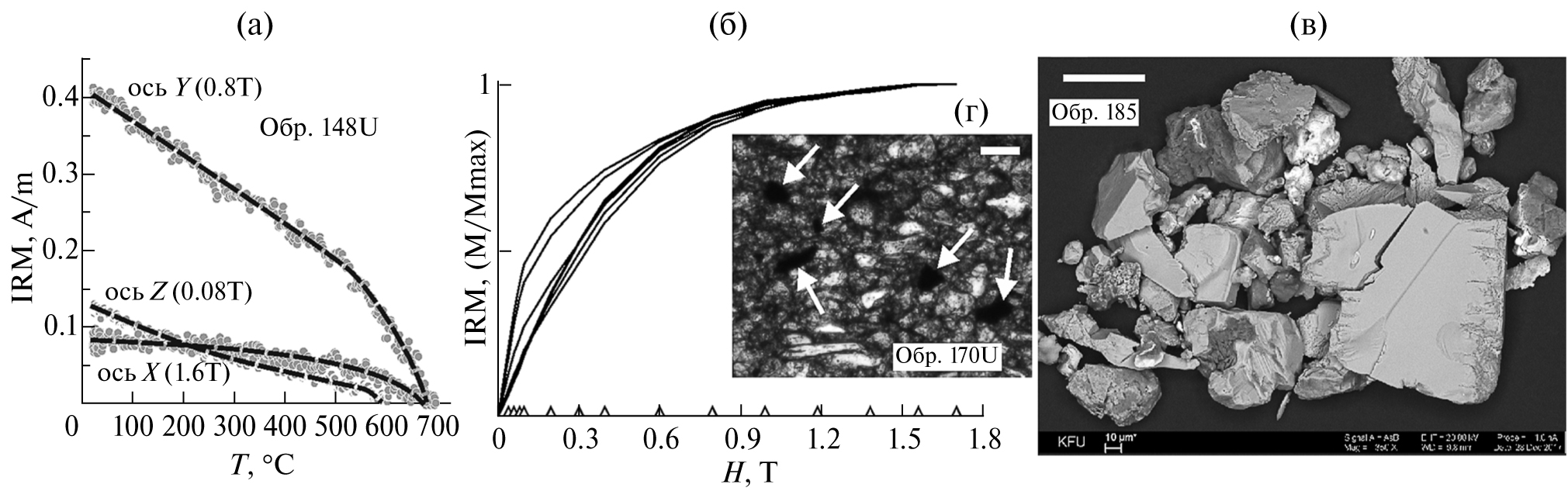 Рис 4. (а) – Пример терморазмагничивания наведенной IRM по трем ортогональным осям (анализ Лоури) в полях 0.08, 0.8 и 1.6 Тл; (б) – примеры кривых нормального намагничивания. Треугольные маркеры по оси Х соответствуют величинам намагничивающего поля в процессе эксперимента; (в) – микрофотоизображение (SEM) магнитной фракции алевродоломитов ничатской свиты; (г) – фотография фрагмента шлифа алевродоломитов ничатской свиты (николи параллельны). Стрелочками отмечены обломки рудных минералов. Масштабная линейка на (в) и (г) 50 мк.