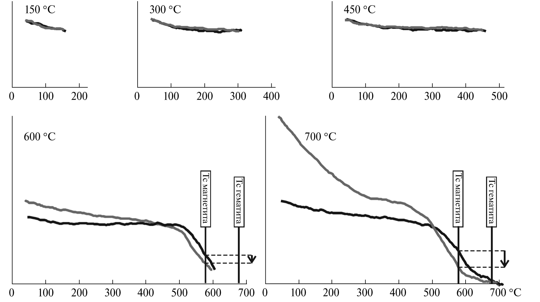 Рис 5. Кривые зависимости магнитной восприимчивости от температуры по серии последовательных циклов нагрева-охлаждения (150, 300, 450, 600 и 700 °С) для одной протолочки алевродоломитов ничатской свиты. Черная линия – нагрев, серая – охлаждение; по вертикальной оси (магнитная восприимчивость) масштаб условный и одинаков для всех экспериментов. Пунктирные линии и стрелки маркируют величину спада магнитной восприимчивости в высокотемпературном интервале, связанную с преобразованием гематита в магнетит.