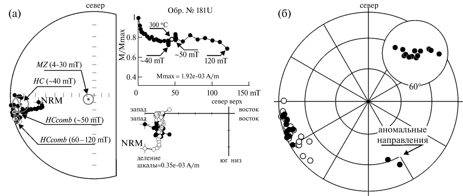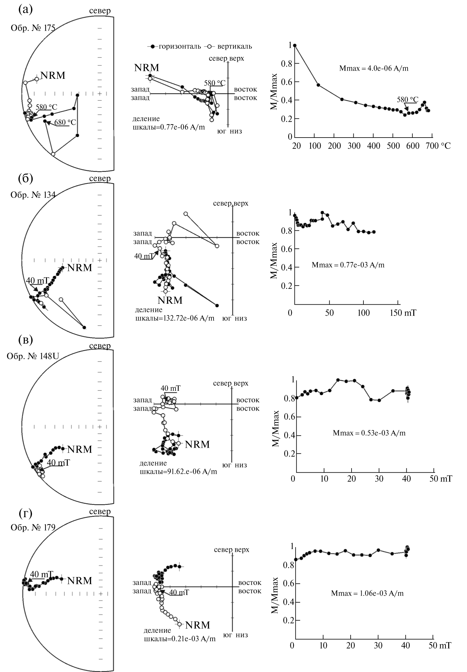 Обнаруженное при термомагнитном анализе новообразование магнетита при нагреве пород подтвердилось результатами температурных магнитных чисток для серии пилотных образцов, показавших сильное лабораторное подмагничивание при прогревах от 580 °C и выше (рис. 6а). Магнитная восприимчивость этих образцов после нагрева на 680 °C возросла в 514 раз. Поэтому палеомагнитная коллекция была подвержена чистке переменным магнитным полем, не оказывающим влияние на минеральный состав породы. Также, для палеомагнитно-стабильных уровней (см. ниже) было дополнительно изучено по три образца-дубля с применением комбинированной чистки температурой и переменным полем.