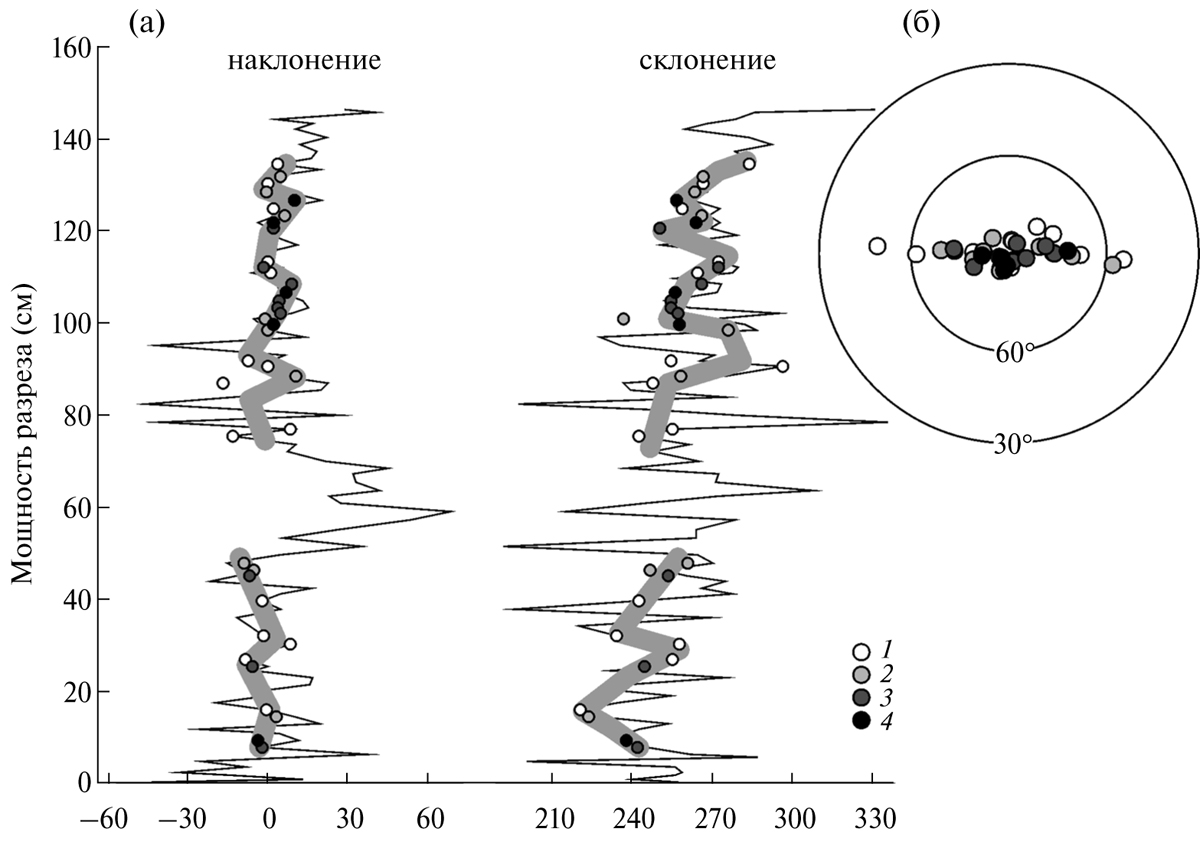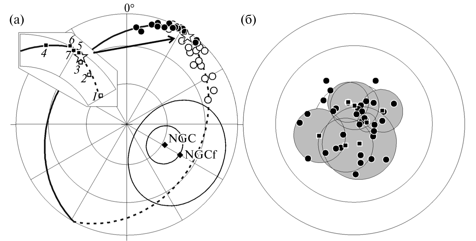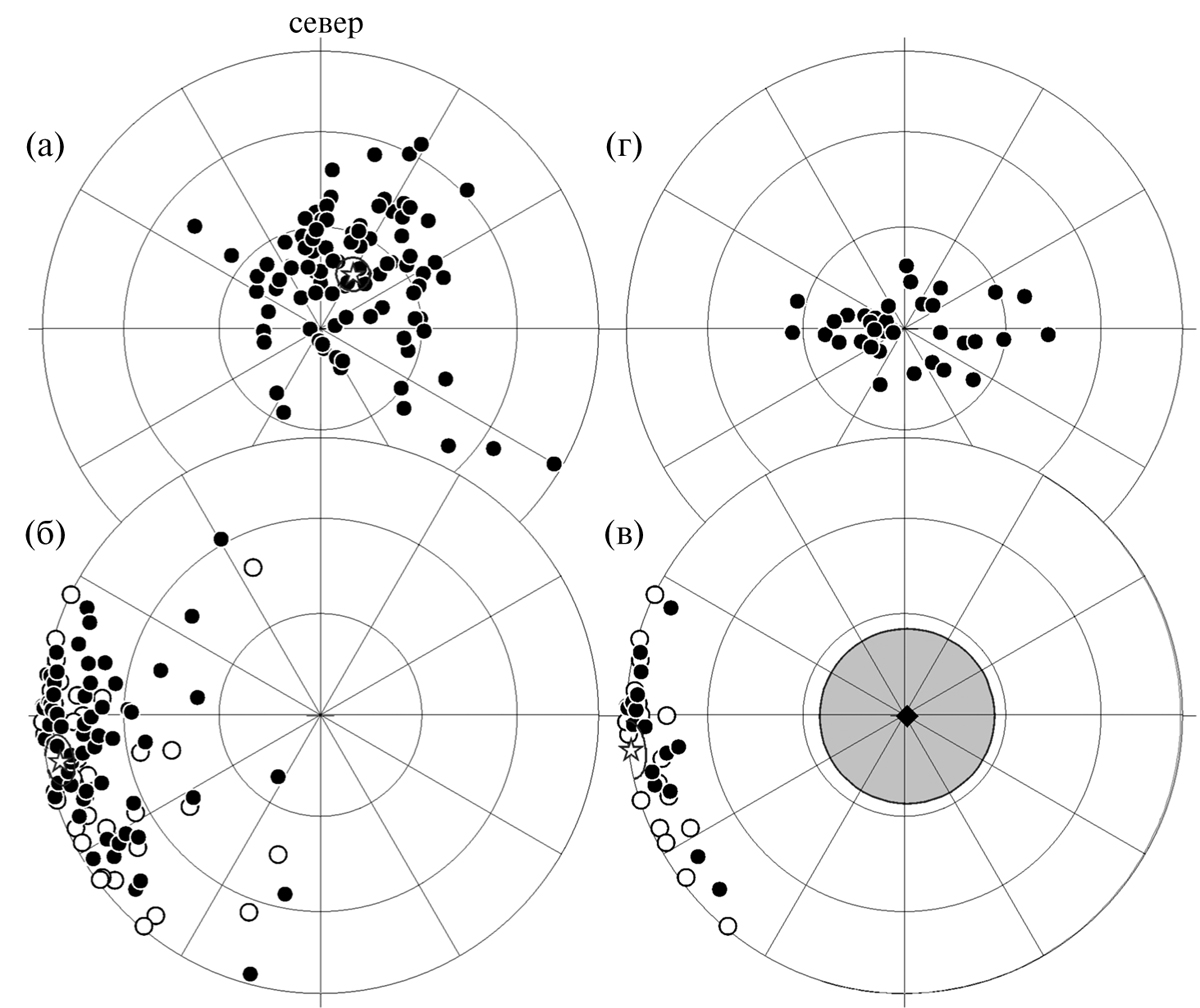 Необходимо отметить, что среднее направление HC-компоненты, рассчитанное по всем образцам коллекции и по наиболее стабильным образцам (табл. 1, рис. 7б, 7в), отличается на первые градусы, при этом, однако, кучность распределения векторов по «палеомагнитно-стабильной» части коллекции вдвое больше, что оправдывает использованную методику селекции.