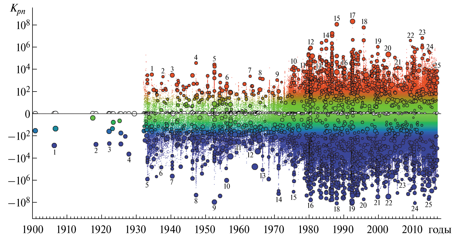 На рис. 1 отображены значения прогнозной нелинейности[2] для всех определений, у которых а также отображены экстремумы прогнозной нелинейности, связанные с сильными землетрясениями. Как можно видеть, экстремумы прогнозной нелинейности, свойственные сильным землетрясениям, как правило, соответствуют аналогичным экстремумам сейсмического потока в целом.