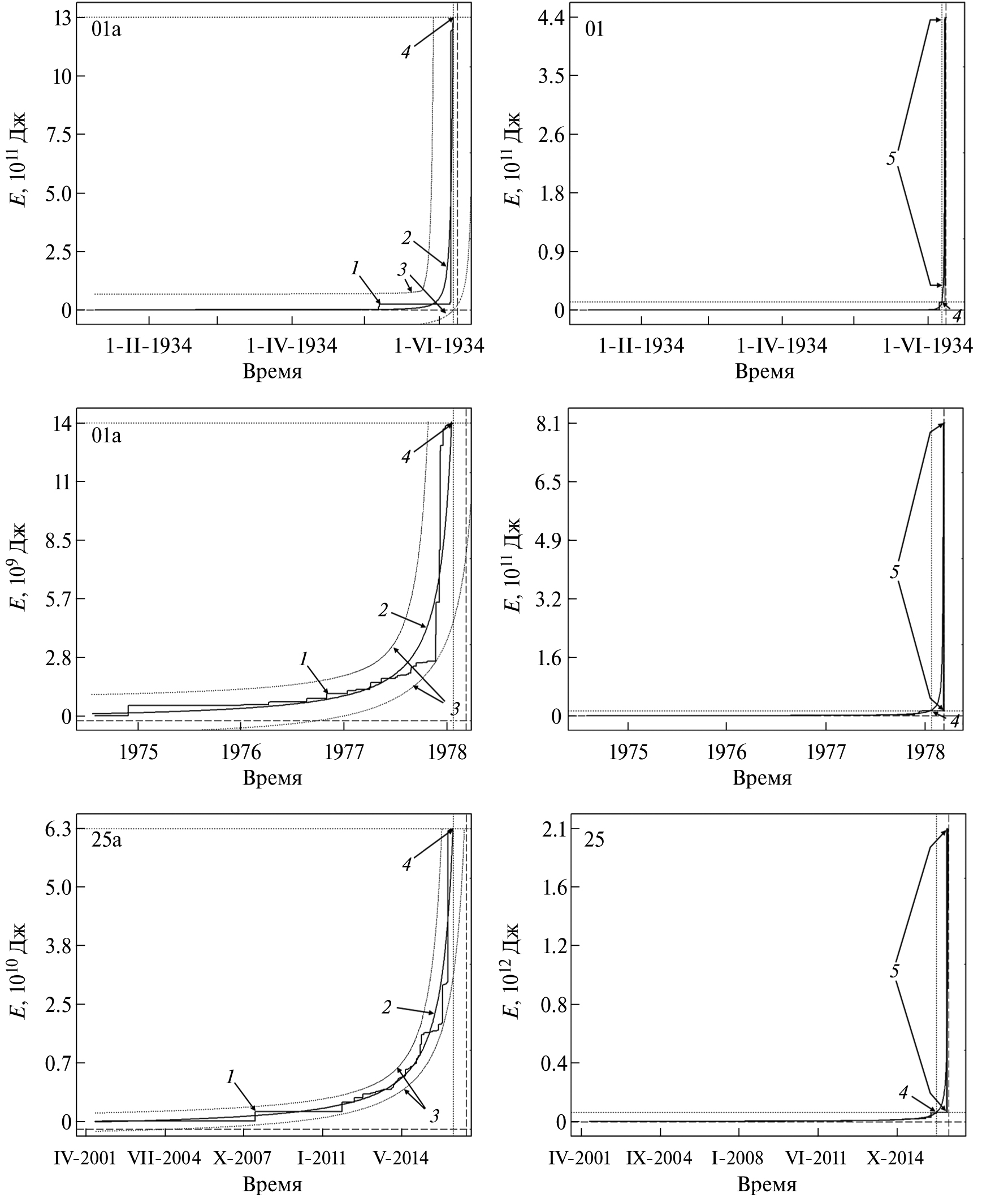 Примечание: и число событий в аппроксимационной и экстраполяционной (прогнозной) частях последовательности, значения асимптоты и коэффициента k приведены с учетом размерности параметра E Дж;