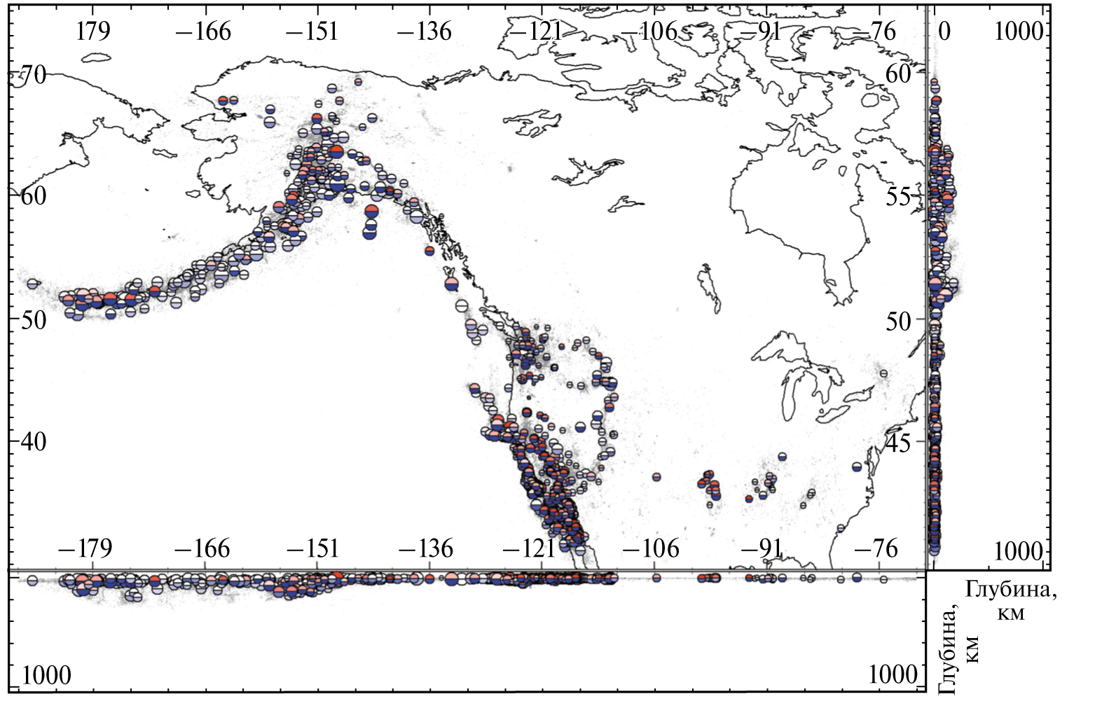 Рис. 4. Пространственное распределение сейсмичности и прогнозируемость сильных землетрясений Северной Америки в 1900–2016 гг. Точками серого цвета показано положение гипоцентров землетрясений по данным каталога Геологической службы США. Круги соответствуют гипоцентрам сильных землетрясений; интенсивность заливки верхнего и нижнего полукружий пропорциональна, соответственно, форшоковой и афтершоковой прогнозируемости данного землетрясения (по экстремуму прогнозной нелинейности).