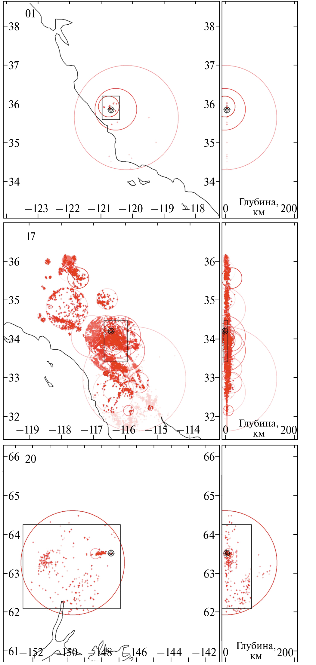 Рис. 5. Зоны форшоковой активизации перед некоторыми сильными землетрясениями: 01 – за сутки до землетрясения 08.06.1934 г. (M = 5.8) 17 – за 30 суток до землетрясения 28.06.1992 г. (M= 7.3) 20 – за 5 суток до землетрясения 03.11.2002 г. (M = 7.9) Нумерация соответствует табл. 4 и верхней части рис. 1. Двойной круг с перекрестием – гипоцентр будущего сильного землетрясения; окружности соответствуют выборкам, в которых выявлена активизация; крестики – гипоцентры землетрясений, входящих в последовательности активизации; прямоугольник ограничивает средневзвешенную зону активизации ±3σ от ее статистического центра).