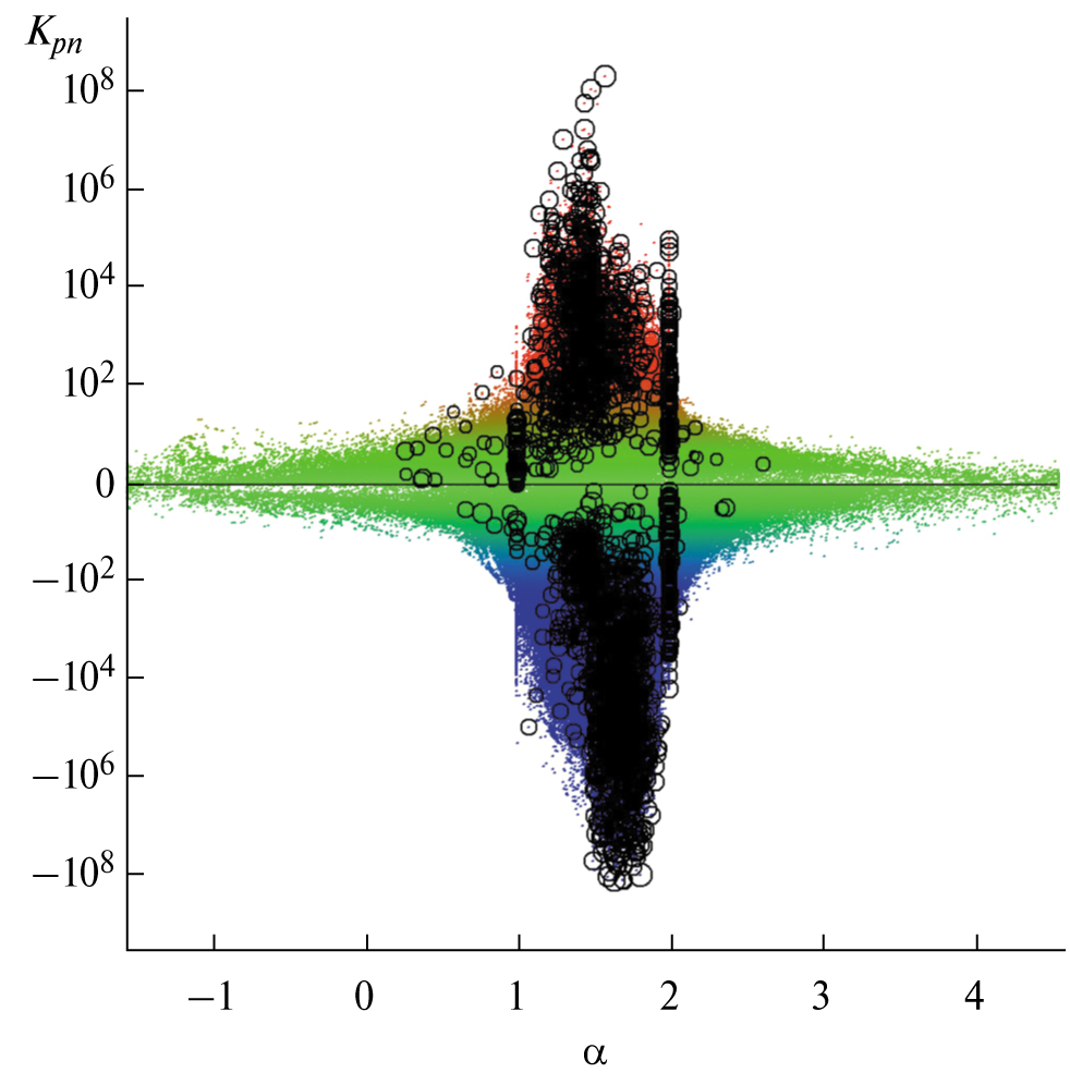 Рис. 2. Прогнозная значимость показателя степени нелинейности α. См. примечание к рис. 1.