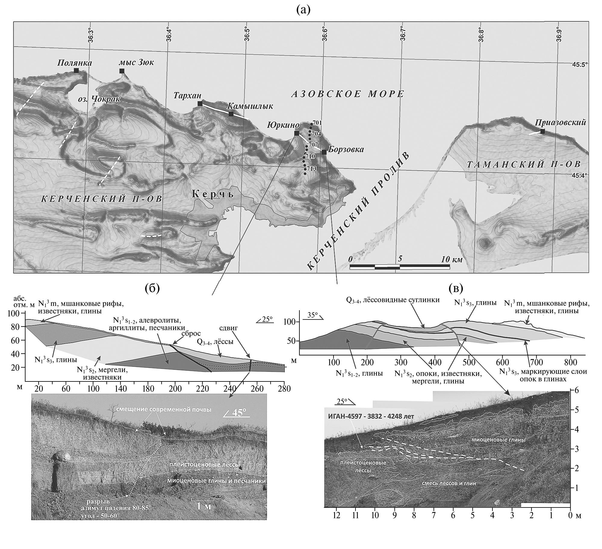 На крайнем юго-востоке полуострова (мыс Такиль) был обнаружен ветвящийся сдвиговый разрыв (сейсмотектонический ров с погребенной палеопочвой). В урочище Печка задокументирован молодой надвиг, проникающий в позднеплейстоцен-голоценовые лёссы и почвенный покров. Уже в 1.5 км к северо-западу от урочища Печка, в районе затопленного античного городища Акра, задокументирован позднеголоценовый сдвиго-сброс с опущенным северо-восточным крылом (рис. 2в). О преобладании сдвиговой компоненты свидетельствуют ориентировка борозд скольжения и соприкосновение по разрывам разных фациальных разностей одних и тех же слоев, включая позднеголоценовые покровные отложения. По данным ММЗ разлом на этом участке проникает на глубину порядка 9 км. Он имеет сбросовую морфологию с крутым падением на север и опущенным северо-восточным крылом. Здесь же, в опущенном крыле разлома, расположено затопленное античное городище Акра, где на глубине около 3 м обнаружены остатки оборонительной стены высотой до 1.5 м [Шилик, 1988; Вахонеев, 2015]. Удивительно хорошая сохранность подводной оборонительной стены свидетельствует о том, что она избежала длительное воздействие морских волн в волноприбойной зоне. Это дает основание предположить, что затопление городища произошло резко, в результате импульсной подвижки по разлому и погружении участка побережья. На северо-восточном фланге Тобечикский разлом представлен позднеголоценовым сбросом с правосдвиговой компонентой смещений. Изменчивость кинематики смещений в молодых отложениях связана с преобладанием сдвиговой компоненты смещений по разлому, не обнаруживаемой на геофизическом разрезе.