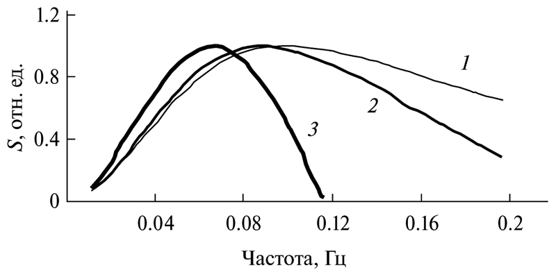 Рис. 1. Нормированные спектры сигнала S при многократном отражении в волноводе: 1 – спектр исходного сигнала (m = 0); 2 – отраженного на расстоянии 1000 км от источника (m = 4); 3 – отраженного на расстоянии 2000 км от источника (m = 8).
