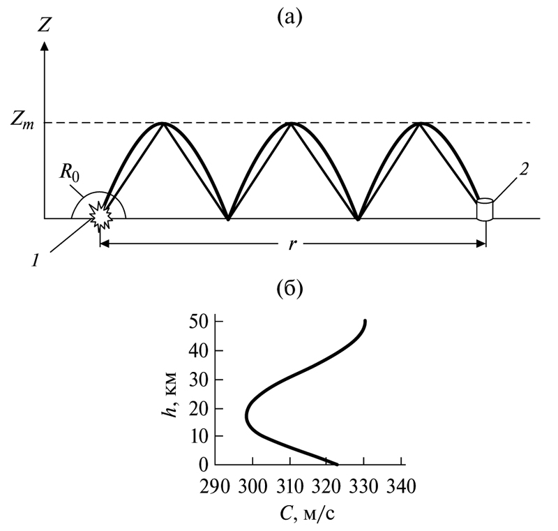 Высота отражения Zm и кратность отражения m при известном расстоянии r рассчитывались по лучевой теории, для модели стандартной атмосферы (рис. 2б), исходя из следующих условий [Бреховских, 1973]. Расстояние, которое луч проходит за одно отражение (m = 1):
