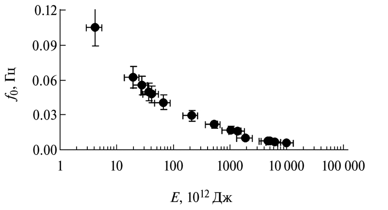 Результаты обработки выбранных сигналов приведены в табл. 2 отдельно для взрывов из разного диапазона энергий. Построенная по результатам экспериментов зависимость характерной частоты от энергии источника приведена на рис. 7. Максимум погрешности оценки энергии источника не превышает 50% при среднем значении 16%. Это позволяет записать обобщенную зависимость энергии от характерной частоты в виде: