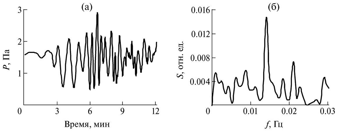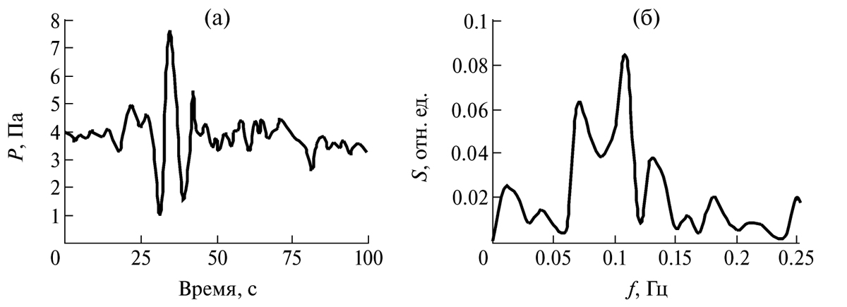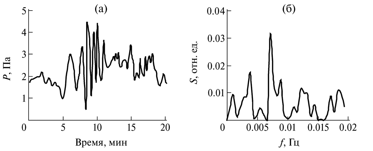 Рис. 4. Инфразвуковой сигнал (а) и его спектр S (б) от взрыва с q = 4.6 кт на расстоянии 1100 км.