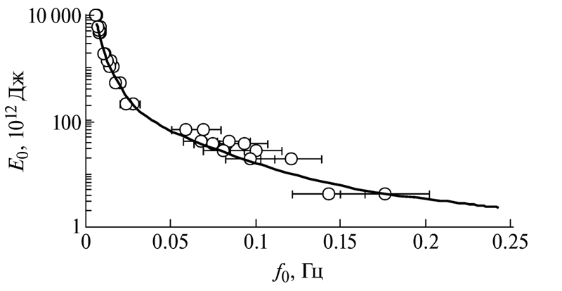 Рис. 7. Зависимость энергии источника Е0 от характерной частоты f0 по данным инструментальных наблюдений (вертикальные и горизонтальные черточки – интервал погрешности оценки величин); сплошная кривая – расчет по формуле (14).