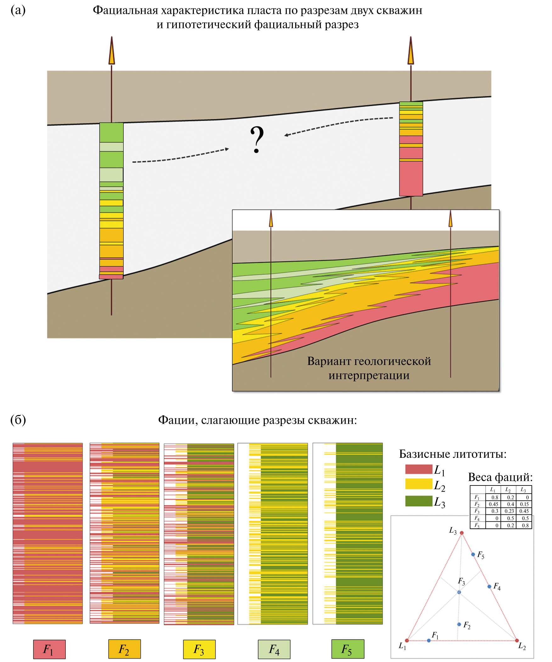 Современный подход к построению геологических моделей осадочных комплексов основан на реконструкции обстановок осадконакопления, установлении связей литологического состава пород с процессами седиментации через систему генетически связанных фаций и последующем моделировании распределения фаций в пространстве. Фациальная принадлежность пород наиболее уверенно диагностируется вдоль стволов скважин на основе изучения данных керна и ГИС. Поэтому основной задачей при построении пространственных априорных геологических моделей является оценка вероятностей P (Fi) в межскважинном пространстве.