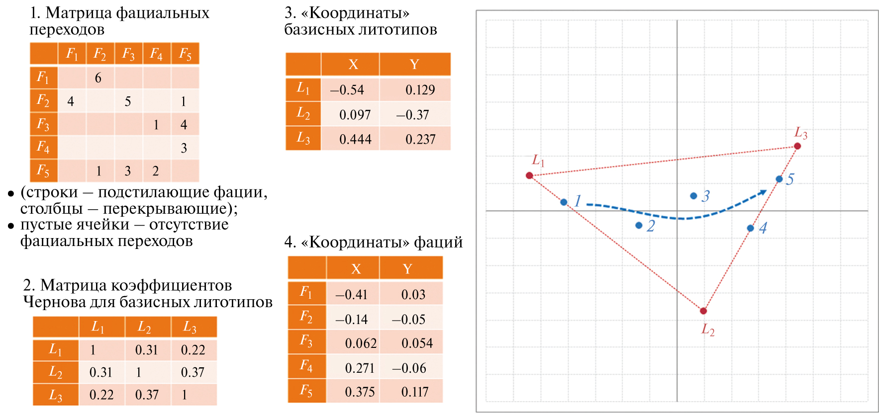 Основная идея настоящей работы состоит в том, чтобы описать наблюдаемое или предполагаемое разнообразие обстановок осадконакопления, представленное набором из N фаций {Fi}, небольшим числом независимых факторов, количество которых существенно меньше N. При этом близкие по генезису фации должны характеризоваться близкими значениями этих параметров. Рассмотрим кратко принципы, лежащие в основе предлагаемого подхода.