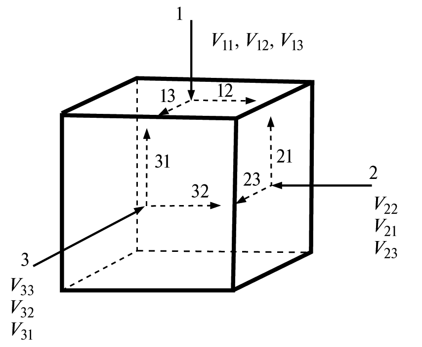 Рис. 2. Индексация величин скорости распространения упругих колебаний в кубическом образце.