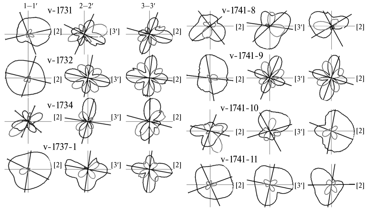 Полученные акустополяриграммы образцов пород Кучин-тундра приведены на рис. 3 последовательно для первой, второй и третьей граней. На диаграммах ВС минимумы амплитуд сигнала определяют положение элементов симметрии. Эти элементы изображены в виде прямых линий, проходящих через центр фигуры.
