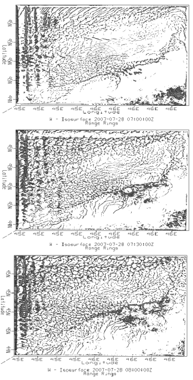 Рис. 2. Изоповерхности вертикальной компоненты скорости ветра, W = 1 м/с, вид сверху. Концентрические окружности обозначают расположение точки наблюдений, высота области по вертикали примерно 3 км. Модель WRF-ARW 28 июля 2007 г., сверху вниз: 7UTC. 7:30 UTC и 8UTC.