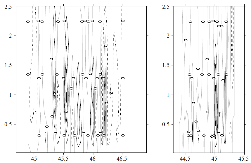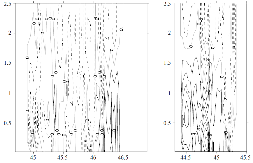 Пространственный период однонаправленных валиков оценивался по полям вертикальной скорости, построенных в широтном 45.3° с. ш. и долготном 46.04° в. д. (рис. 4) разрезах, и составляет 3 ÷ 5 км. Горизонтальный масштаб в поперечном сечении — 2 ÷ 3 км, по вертикали квазидвумерные вихри могут распространяться на всю толщину экмановского пограничного слоя. Максимальная положительная и отрицательная скорость в широтном разрезе составляет 5.084 м/с и –4.448 м/с соответственно; для долготного разреза — 5.692 м/с и –3.403 м/с соответственно.