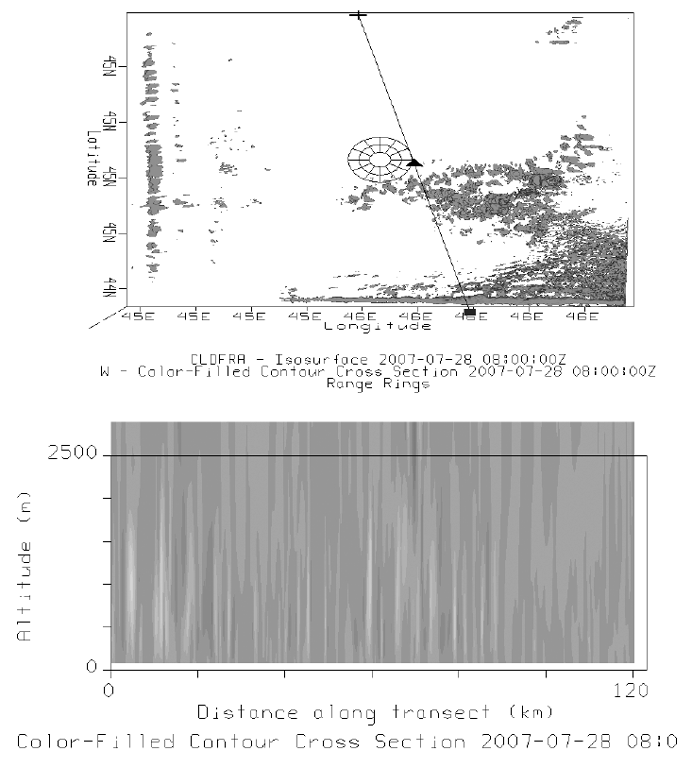 Рис. 7. Пространственное распределение вертикальной скорости по оси Z и по оси, приблизительно перпендикулярной оси валов (черная линия со стрелкой на верхнем рисунке). Диапазон изменения скорости примерно от –7 м/с (темно-серый цвет на нижнем рисунке) до –6 м/с (светло-серый цвет на нижнем рисунке). Модель WRF-ARW, 28 июля 2007 г., 8UTC. Шаг сетки 180 м. По оси ординат — высота Z в м, по оси абсцисс — расстояние вдоль наклонной кривой (верхний рисунок) в км. На верхнем рисунке представлена область расчета.