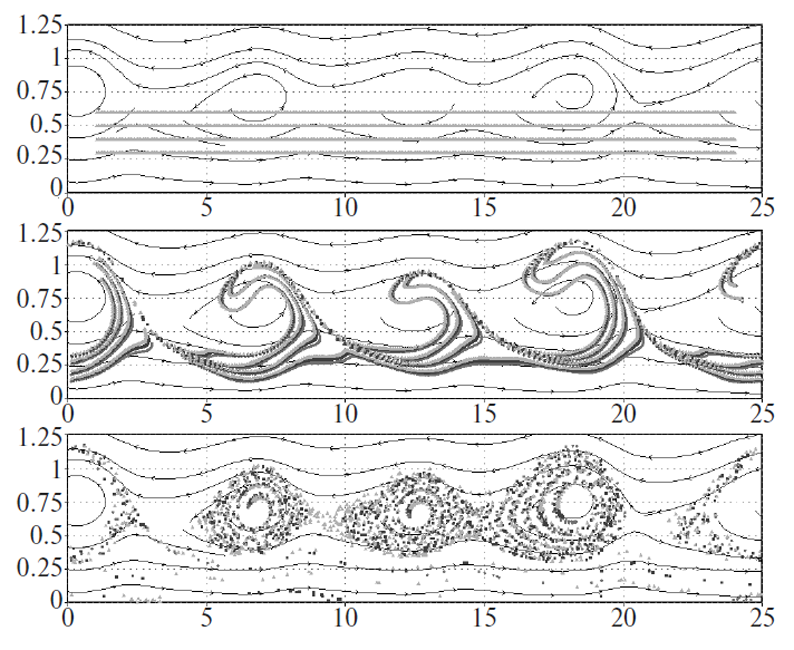 Рис. 11. Захват частиц аэрозоля квазидвумерными вихрями. Траектории движения частиц. Сверху вниз изображены три момента времени – начальный вброс частиц в поток, промежуточное движение, циркуляция уловленных частиц внутри валов. Темно-серыми кругами, черными квадратами и светло-серыми треугольниками обозначены, соответственно, частицы с медианным размером 6, 5 и 4 мкм. Вид сверху. Движение валиков происходит слева направо. По осям абсцисс и ординат – координаты в безразмерном виде, описание см. [25], моменты времени (сверху вниз): 0 ч, 1ч 30 мин, 6 ч 12 мин с момента начала расчета.