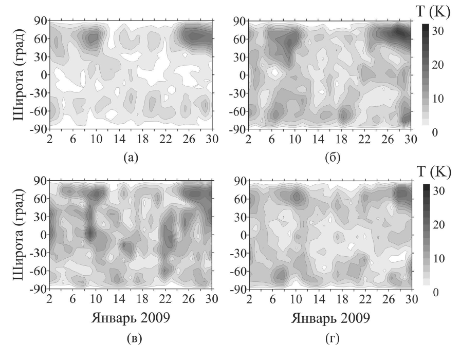 В работе были рассмотрены планетарные и приливные вариации температуры, возникающие в период ВСП-2009. Моделирование охватывало период со 2 по 31 января 2009 г. Стратосферное потепление началось 17 января, прошло максимум 23–24 января и закончилось в феврале. Разворот циркумполярного вихря произошел 22 января. Наблюдения показали [7], что во время этого потепления отмечалось усиление планетарной и приливной волновой активности. Результаты моделирования этой активности в модели EAGLE представлены далее.