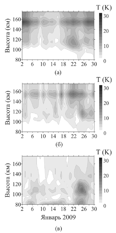 Модель EAGLE-80 практически не генерирует полусуточную солнечно-мигрирующую приливную волну (SW2), в то время как в EAGLE-120 она существенно зависит от прохождения потепления. Как на высоте 103 км, так и на высоте 121 км имеются явно выраженные максимумы после 25 января. Значения амплитуды вариации достигают 30 K на высоте 103 км и 60 K на высоте 121 км, что несколько превосходит отмеченные в наблюдениях параметры. В то же время, широтная структура SW2 с двумя симметричными относительно экватора максимумами в низких широтах хорошо согласуется с данными наблюдений [8, 13].